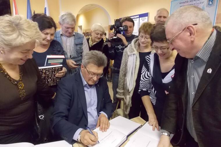 – Я помню первые книги о Севере Анатолия (с ним мы давние знакомые), – вступил в разговор Геннадий Зайцев, краевед, историк, музейщик, много лет проработавший в заполярном Яр-Сале, потом на полярном круге в Салехарде. – Это «Салехард», «На арк-тических ветрах», «Рыцари Севера», которые помогли мне в работе, я учитель истории. На этих книгах я учил детей жить в гармонии с природой. «Мир тесен, – высказала свое мнение северянка Вера Федорова, – знакома я с Омельчуком давно – по его книгам. «Книгу Севера» прочитала от корки до корки. Это о нас!» И далее: «Жила в Салехарде на улице Мичурина, где в одной из квартир жили журналисты – к ним захаживал и Анатолий Омельчук».