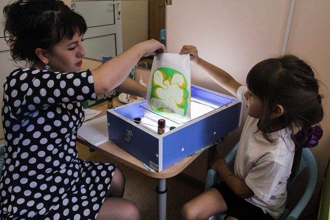 Песок – это хорошо, когда на улице он в песочнице, а в помещении – внутри специального столика. Просеянная и прокаленная, а значит без микробов, податливая «материя» позволяет ребятам рисовать на ней сказки. Но особенно ученикам Сандаковой нравится воспроизводить были и былины. Правда, песочная терапия – вчерашний день, а вот то, что ново и многим незнакомо – эбру: рисование красками на воде, а затем перенос рисунка на бумагу, ткань, керамику.