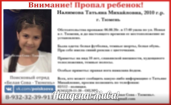 В Тюмени успешно завершились поиски девятилетней Тани Налимовой. К вечеру у сквера Авиаторов собралось большое горожан, готовых помочь в поиске девочки. Нашел ее участковый полицейский в районе 21:30. Как оказалось, девочка просто ушла играть с подружками в соседний двор.