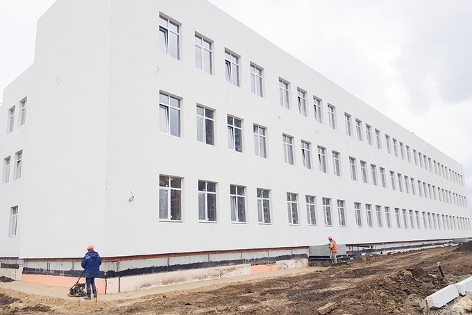 Само здание уже построено. Сейчас идут работы по отделке фасада, монтажу внутренних инженерных сетей, благоустройству территории вокруг школы.
