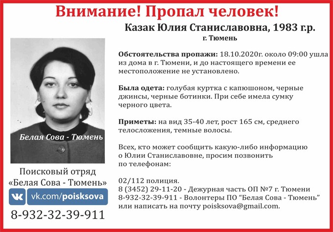 Всех, кто видел Юлию Казак или знает что-либо о том, где она может находиться, просят обращаться по телефонам: 8 (3452) 29-11-20 – дежурная часть отдела полиции №7 города Тюмени; 02 или 112 – полиция; 8-932-32-39-911 – волонтеры поискового отряда «Белая сова – Тюмень». Также информацию можно отправить по электронной почте: poisksova@gmail.com.