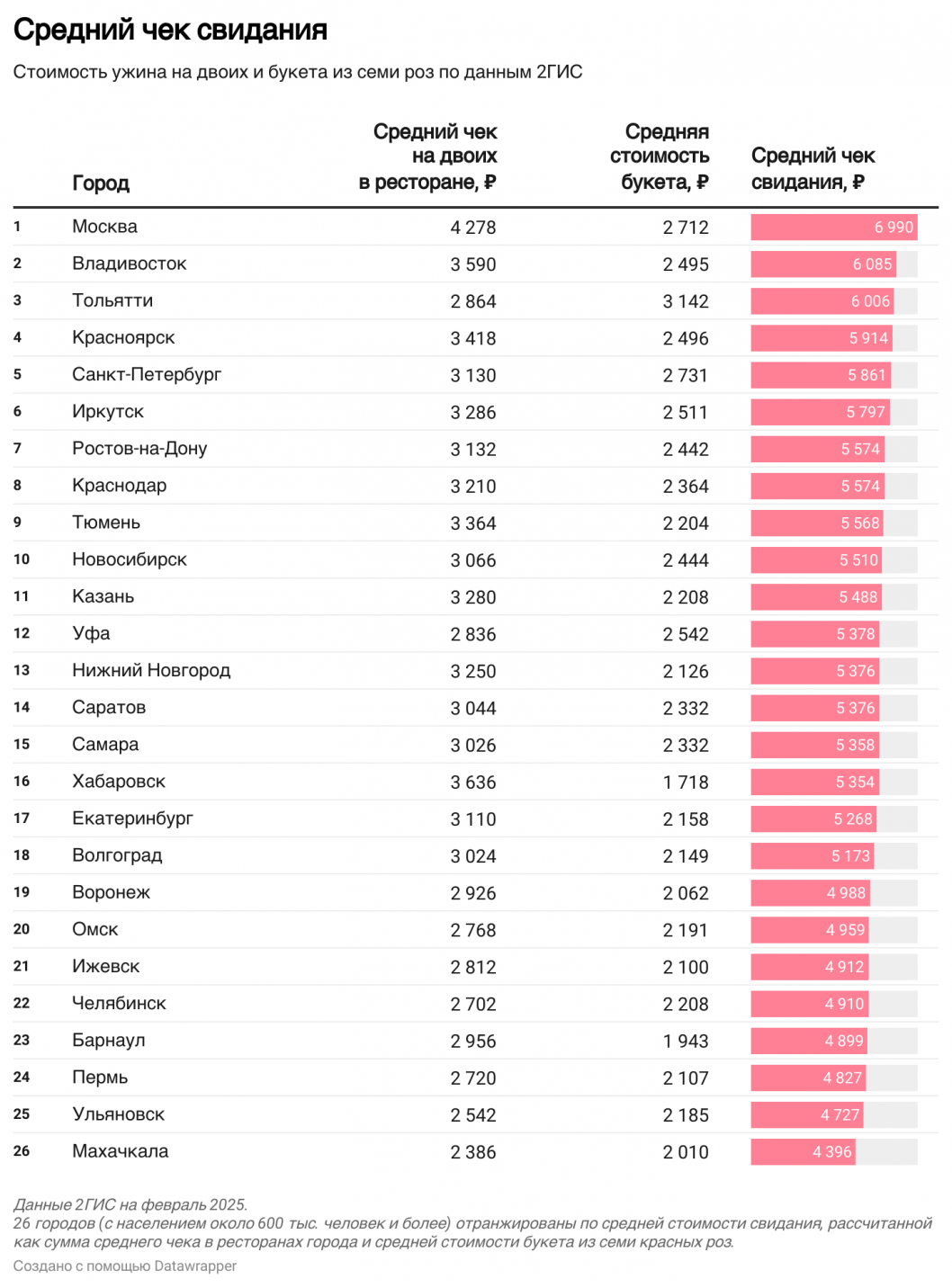 В преддверии Дня влюбленных эксперты 2ГИС подсчитали среднюю стоимость свидания для 26 городов России. В Тюмени она составила 5 568 рублей – это средний чек в ресторане на двоих (3 364 руб.) и средняя цена букета (2 204 руб.). С этими показателями областной центр расположился на девятой строчке топа.