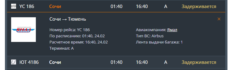 Как сообщает онлайн-табло аэропорта Рощино, самолет должен был приземлиться еще 24 февраля в 01:40. Однако прилет отложен до 16:40 того же дня. Это совмещенный рейс Сочи – Тюмень авиакомпаний «Ямал» (YC 186) и «ЮТэйр» (ЮТ 4186).