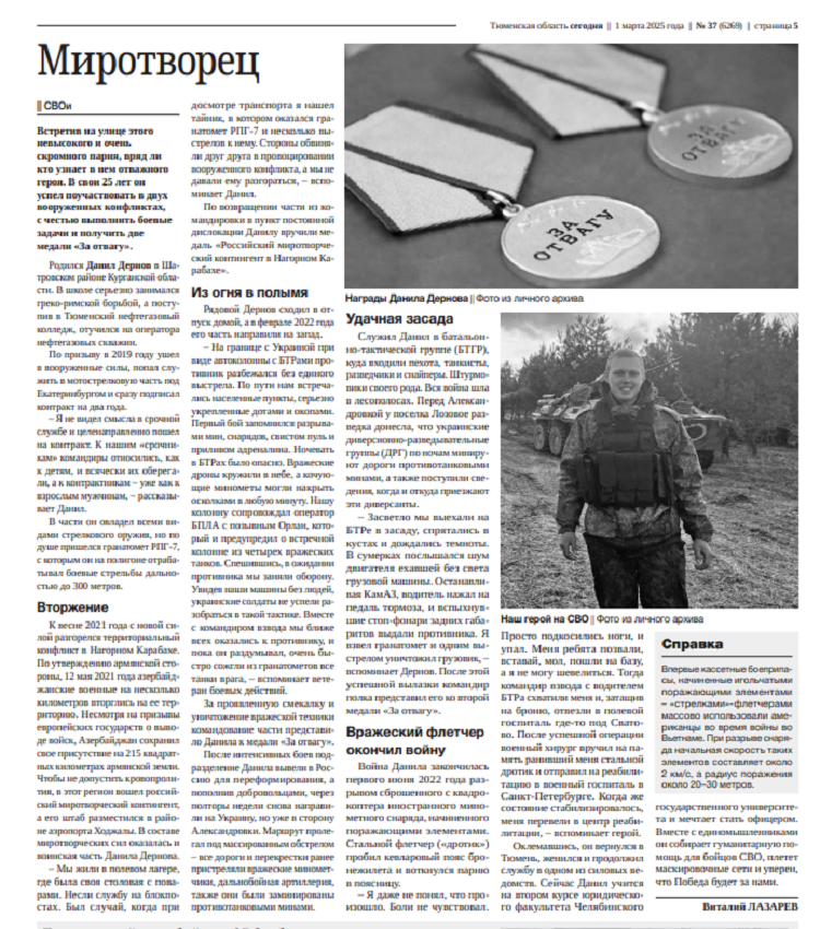 Встретив на улице этого невысокого и очень скромного парня, вряд ли кто узнает в нем отважного героя. В свои 25 лет он успел поучаствовать в двух вооруженных конфликтах, с честью выполнить боевые задачи и получить две медали «За отвагу».
