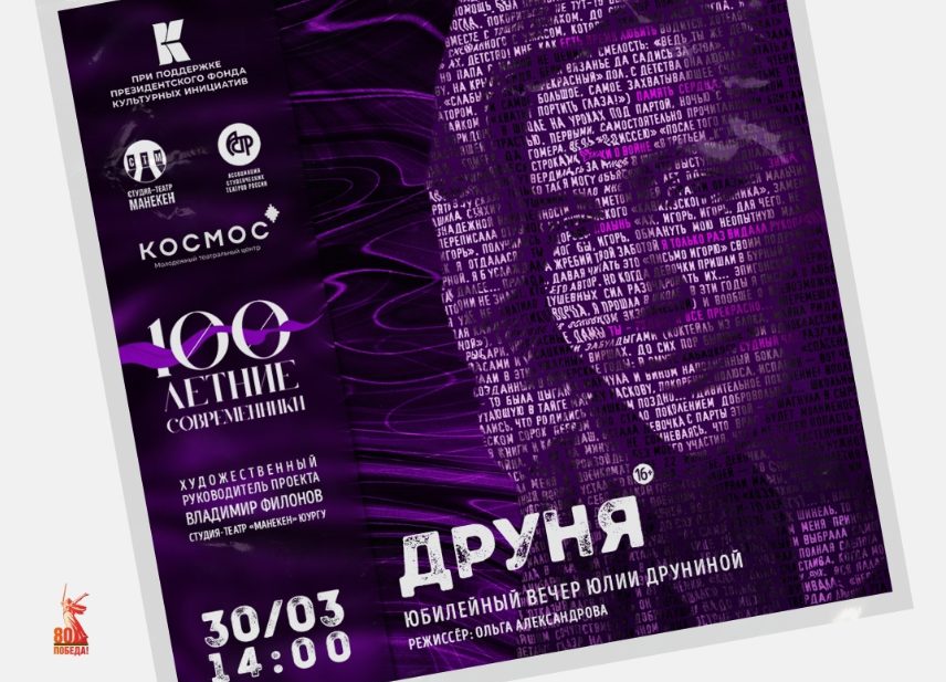 Челябинские артисты студии-театра «Манекен» представят в Тюмени уникальную постановку «Друня» (16+), посвященную творчеству и судьбе поэтессе Юлии Друниной. Премьера состоится 30 марта в 18:00 в стенах Молодежного театрального центра «Космос». Спектакль, созданный к 80-летию Победы, можно посетить бесплатно после регистрации в сообществе МТЦ «Космос» во «ВКонтакте».