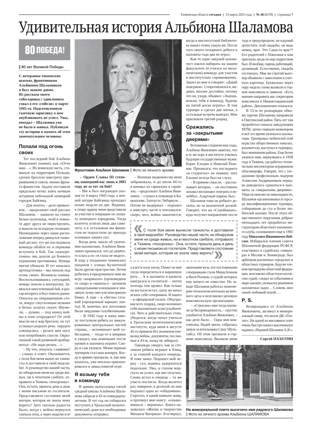 С ветераном тюменских шахмат, фронтовиком Альбионом Шаламовым я был знаком давно. Из рассказа моего собеседника с удивлением узнал о его «гибели» в марте 1945-го. Подготовленную газетную зарисовку о нем опубликовать не успел. Увы, опоздал - Шаламова уже не было в живых. Публикую эту историю в память об этом замечательном человеке.