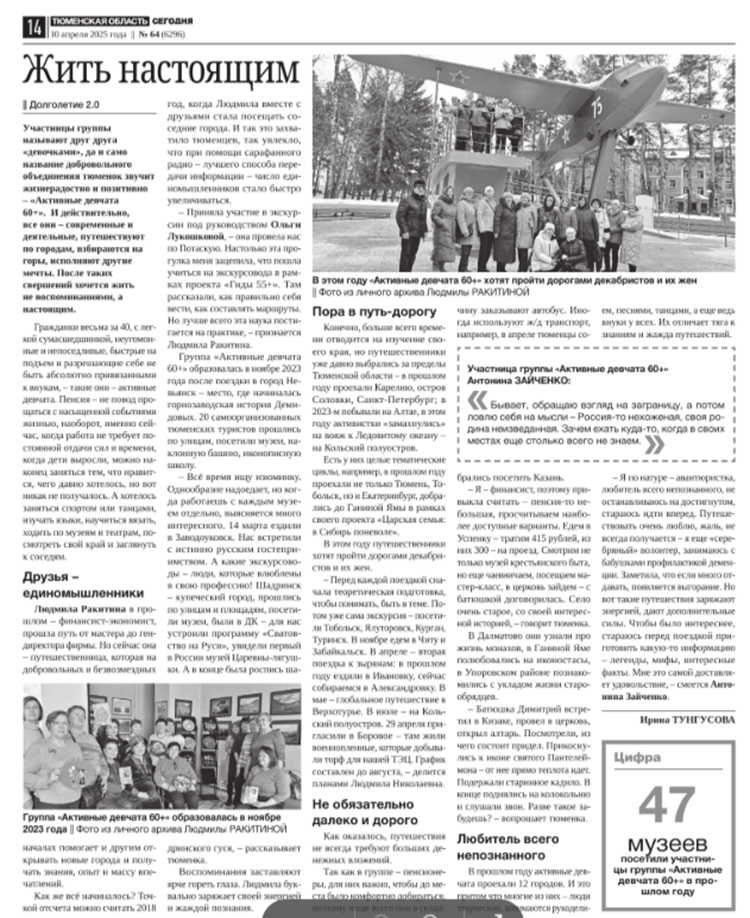 Участницы группы называют друг друга «девочками», да и само название добровольного объединения тюменок звучит жизнерадостно и позитивно – «Активные девчата 60+». И действительно, все они – современные и деятельные, путешествуют по городам, взбираются на горы, исполняют другие мечты. После таких свершений хочется жить не воспоминаниями, а настоящим.