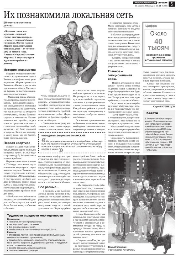 «Большая семья для мужчины – мощный стимул двигаться вперед», – считает тюменец Михаил Голянский. Вместе с женой Марией они воспитывают четверых детей – 14-летнюю Еву, 10-летнюю Лизу, 7-летнего Марка и 5-летнего Мартина. В августе супруги ждут пятого ребенка – девочку.