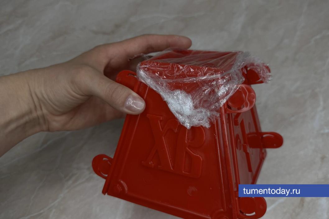 К этому моменту у нас уже должна быть подготовлена форма. Собираем ее обязательно рисунком наружу. Тогда после стабилизации у нас получится четкий, красивый узор. Также важно перекрыть дно формы пищевой пленкой и сразу установить ее на плотную подставку для транспортировки. Как только мы заполним форму, поднимать ее будет уже нельзя, ведь всё содержимое может вытечь.