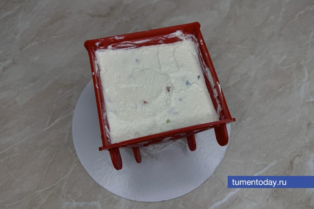 Заполняем форму частями, каждый раз постукивая подставку, чтобы масса хорошо утрамбовалась, и мы могли избежать пустот. После убираем форму в морозильную камеру на 4–5 часов, а лучше на ночь.