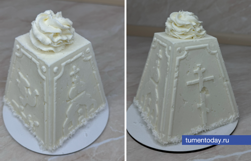 Вверх пасхи можно украсить растопленным шоколадом или использовать крем чиз – как поступила я. Дальше отправляем пасху размораживаться: делать это лучше через холодильную камеру, чтобы она размораживалась постепенно, и вся влага равномерно распределялась по десерту.