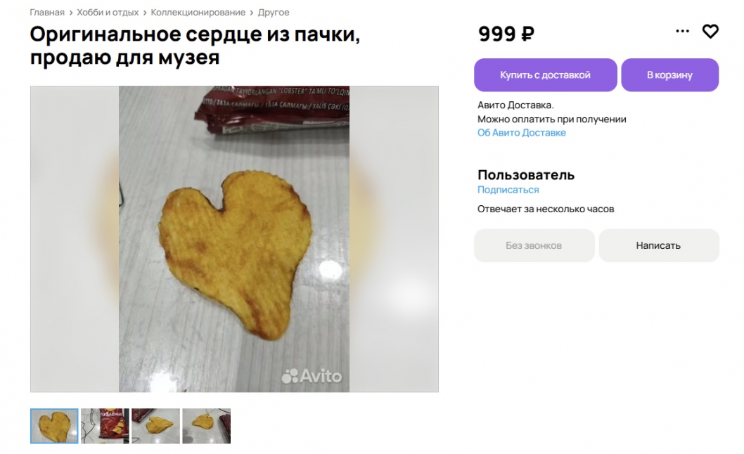– Чипсинку эту нашел 28 декабря 2024 года. Это, получается, вкус лобстера, – рассказал «Тюменской области сегодня» продавец необычной валентинки Алексей. – Недавно мужчина предложил чипсинку поменять на автомобиль, но, думаю, это шутка. В основном все комментируют – что-то вроде «бизнесмен». У всех улыбку вызывает, мол, прикольное объявление, но пока не покупают.