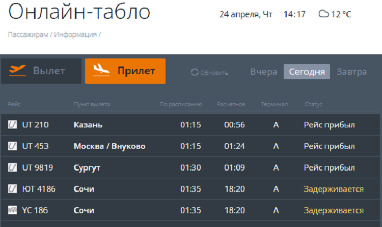 Самолет из Сочи в Тюмень задерживаются на несколько часов. Совмещенный рейс ЮТ 4186 авиакомпании «ЮТэйр» и YC 186 компании «Ямал» должны были прибыть в областной центр в 01:35, однако до сих пор не прибыл. Согласно данным онлайн-табло тюменского аэропорта, расчетное время их прибытия – 18:20.