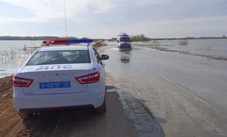 В Тюменской области движение на дороге Казанское – Малые Ярки ограничили из-за паводка. Наряд ДПС несет службу на 2-м километре трассы, где водой залило проезжую часть.