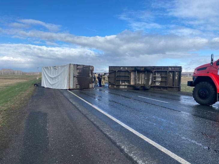 Водитель ехал со стороны Омска к Тюмени, и по пути грузовик MAN с полуприцепом, груженый пенопластом, настиг сильный ветер. От этого он опрокинулся.