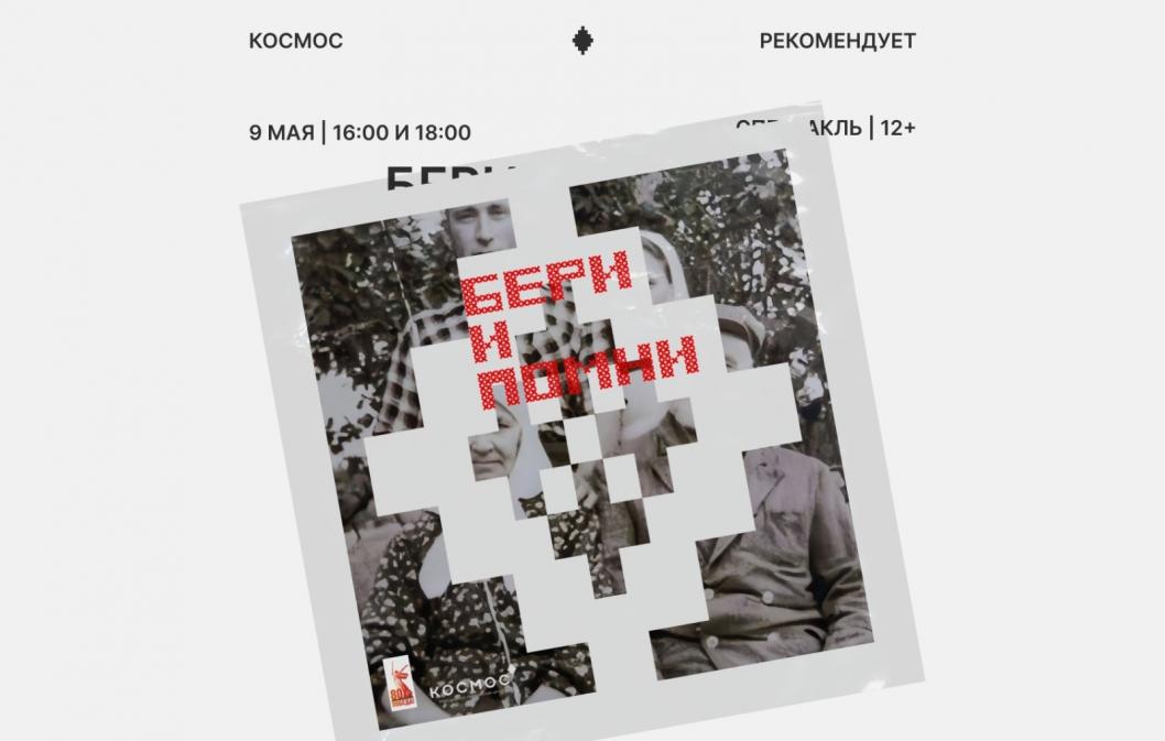 В День Победы тюменцев приглашают на спектакль в новой форме «Бери и помни» (12+). Премьера состоится 9 мая в 16:00 и 18:00 в стенах Молодежного театрального центра «Космос». Посетить спектакль можно бесплатно, зарегистрировавшись в группе учреждения во «ВКонтакте».