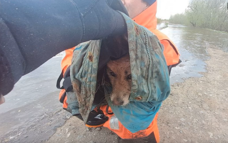 Тюменские спасатели эвакуировали собаку с подтопленной территории в Ишиме