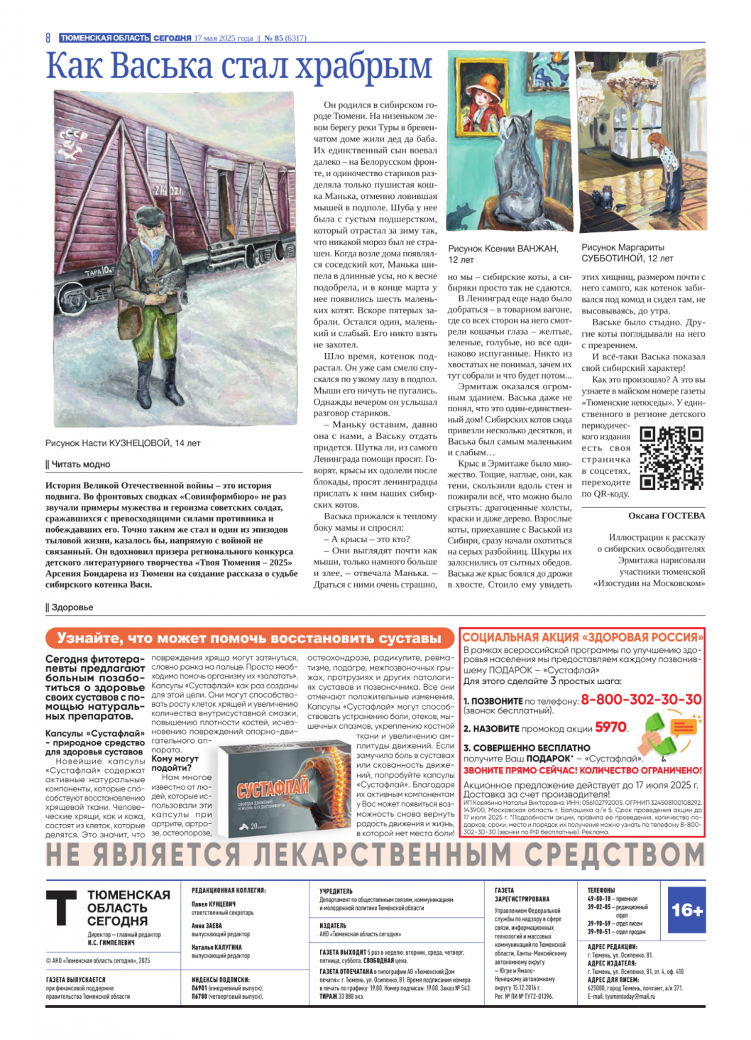 Точно таким же стал и один из эпизодов тыловой жизни, казалось бы, напрямую с войной не связанный. Он вдохновил призера регионального конкурса детского литературного творчества «Твоя Тюмения – 2025» Арсения Бондарева из Тюмени на создание рассказа о судьбе сибирского котенка Васи.