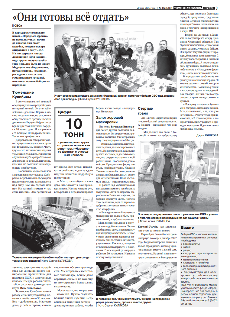 В коридорах тюменского штаба «Народного фронта» не протолкнуться: почти до потолка там стоят коробки, которые вскоре отправятся в зону СВО. На них адреса и иногда лаконичное «Для наших», ведь других получателей у этих посылок быть не может. Медицинское оборудование, ретрансляторы, «мавики», расходники – в составе гуманитарного груза всё, что может помочь бойцам на передовой.