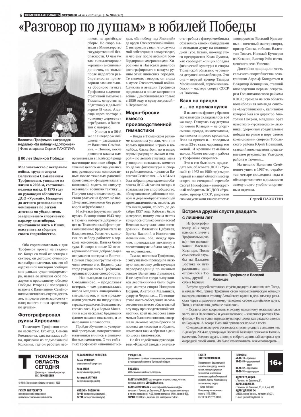 Мое знакомство с ветераном войны, труда и спорта Валентином Семёновичем Трофимовым, ушедшим из жизни в 2008-м, состоялось полвека назад. В 1975 году он руководил облсоветом ДСО «Урожай». Незадолго до летнего регионального чемпионата по легкой атлетике он убедил меня, завершившего спортивную карьеру десятиборца, приехавшего жить в Ишим, выступить за сборную своего спортобщества.