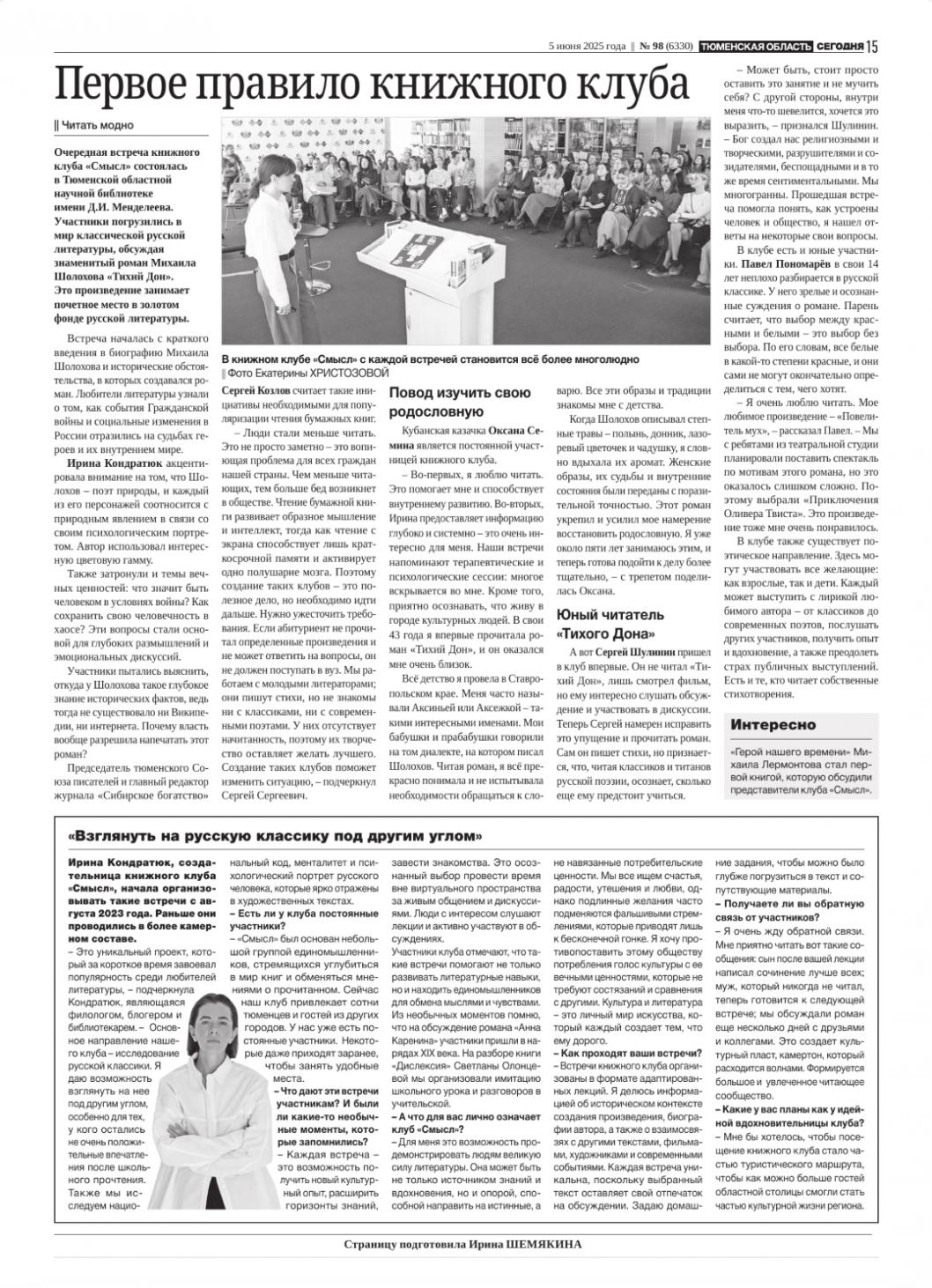Очередная встреча книжного клуба «Смысл» состоялась в Тюменской областной научной библиотеке имени Д.И. Менделеева. Участники погрузились в мир классической русской литературы, обсуждая знаменитый роман Михаила Шолохова «Тихий Дон». Это произведение занимает почетное место в золотом фонде русской литературы.