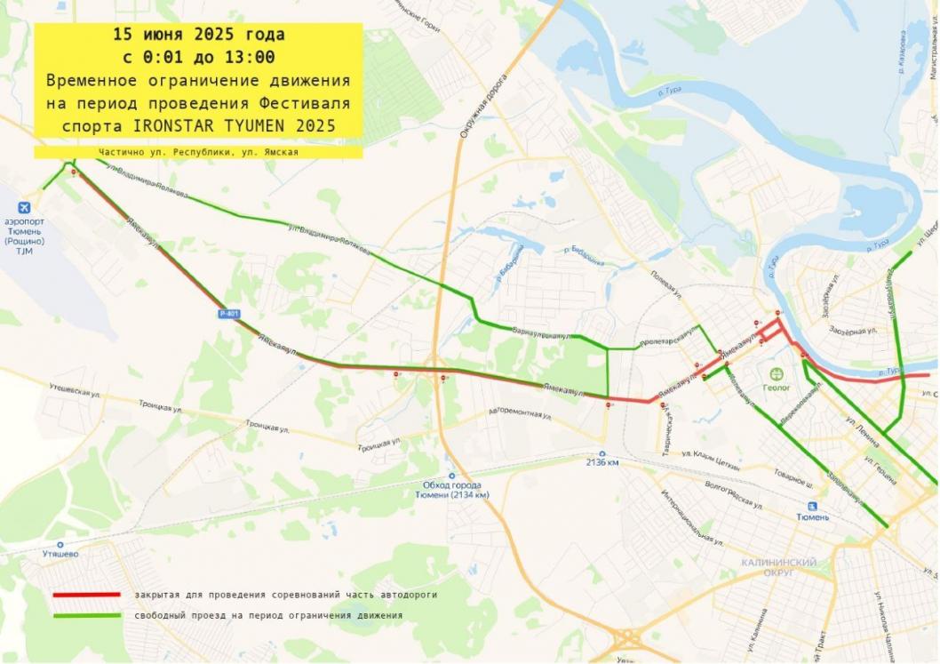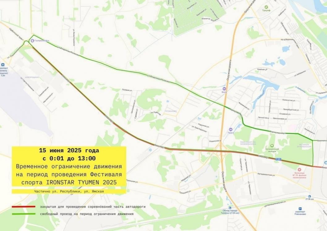 15 июня с 00:01 по 13:00 проезд из аэропорта Рощино в центр Тюмени будет возможен через улицу Владимира Полякова. Движение транспорта изменится в связи с проведением этапа фестиваля по триатлону IRONSTAR. Об этом сообщают в пресс-службе воздушной гавани.
