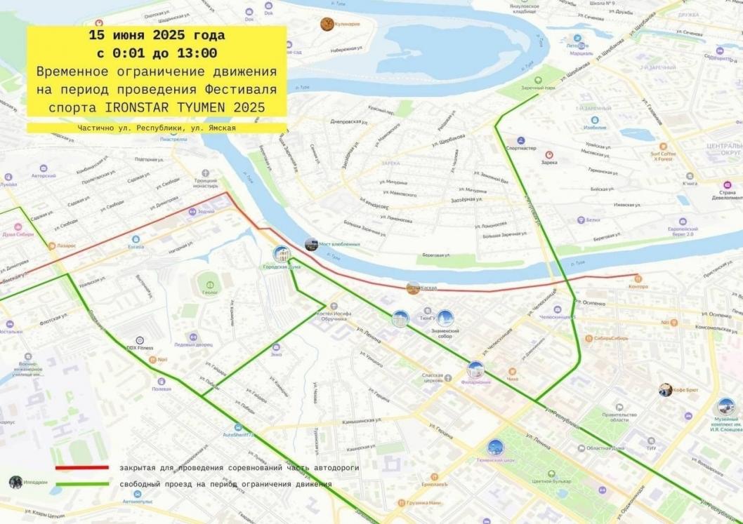 Как сообщает департамент по спорту и молодежной политике города Тюмени, перекрытие коснется участков пути: