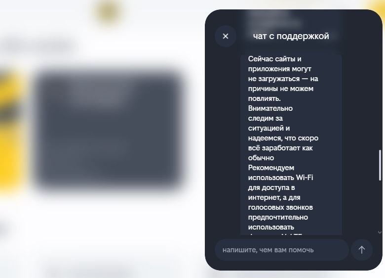 Операторы дают примерно одинаковые ответы: «На данный момент интернет в вашем районе может быть недоступен по независящим от нас причинам. Пожалуйста, подождите. По возможности, подключитесь к интернету по Wi-Fi на период ограничений. Их сроки нам не известны. Голосовая связь в сети T2 работает в штатном режиме».