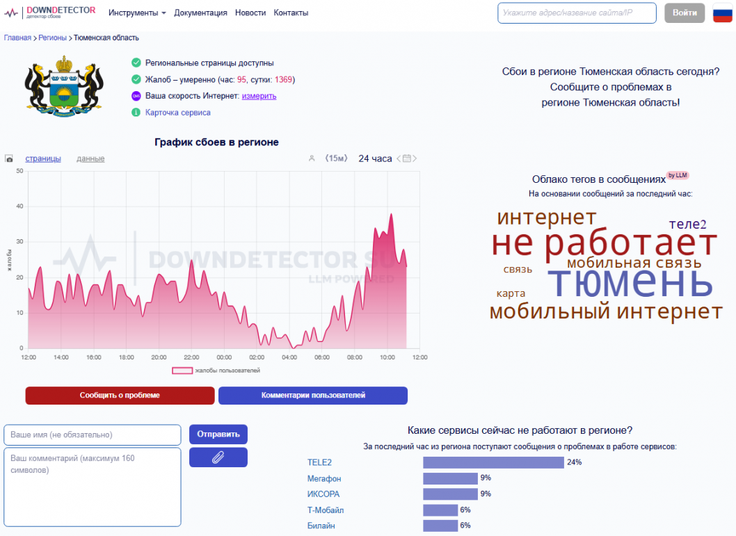 Согласно данным детектора сбоев работы связи, с самого раннего утра в Тюменской области стали поступать сигналы об отказе работы мобильного интернета. К этой минуте больше всего жалоб на работу Т2.