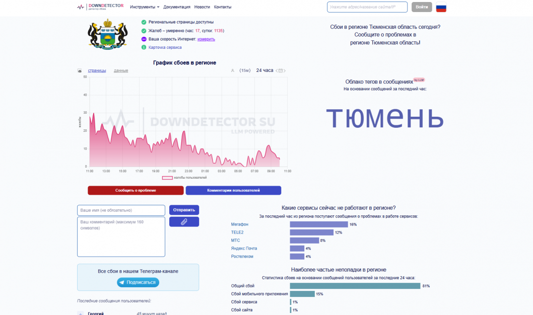 По данным детектора сбоев работы связи, неполадки наблюдаются практически у всех операторов. На утро 17 июня больше жалоб поступало от абонентов «Мегафона», Теле2, МТС.