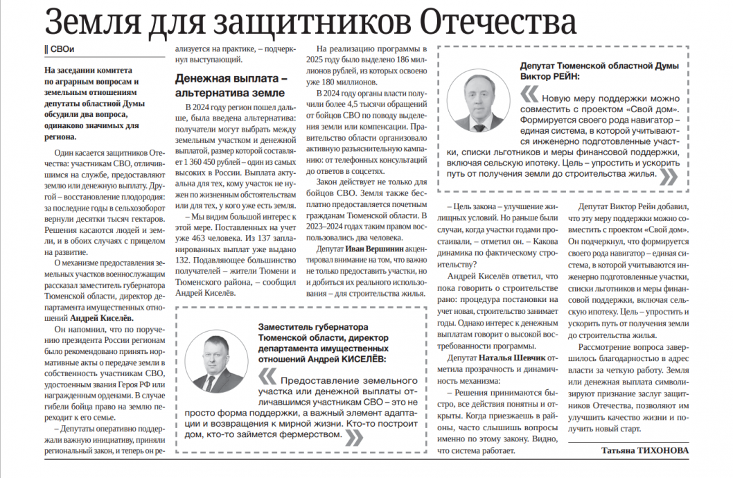На заседании комитета по аграрным вопросам и земельным отношениям депутаты областной Думы обсудили два вопроса, одинаково значимых для региона. Один касается защитников Отечества: участникам СВО, отличившимся на службе, предоставляют землю или денежную выплату. Другой – восстановление плодородия: за последние годы в сельхозоборот вернули десятки тысяч гектаров. Решения касаются людей и земли, и в обоих случаях с прицелом на развитие.