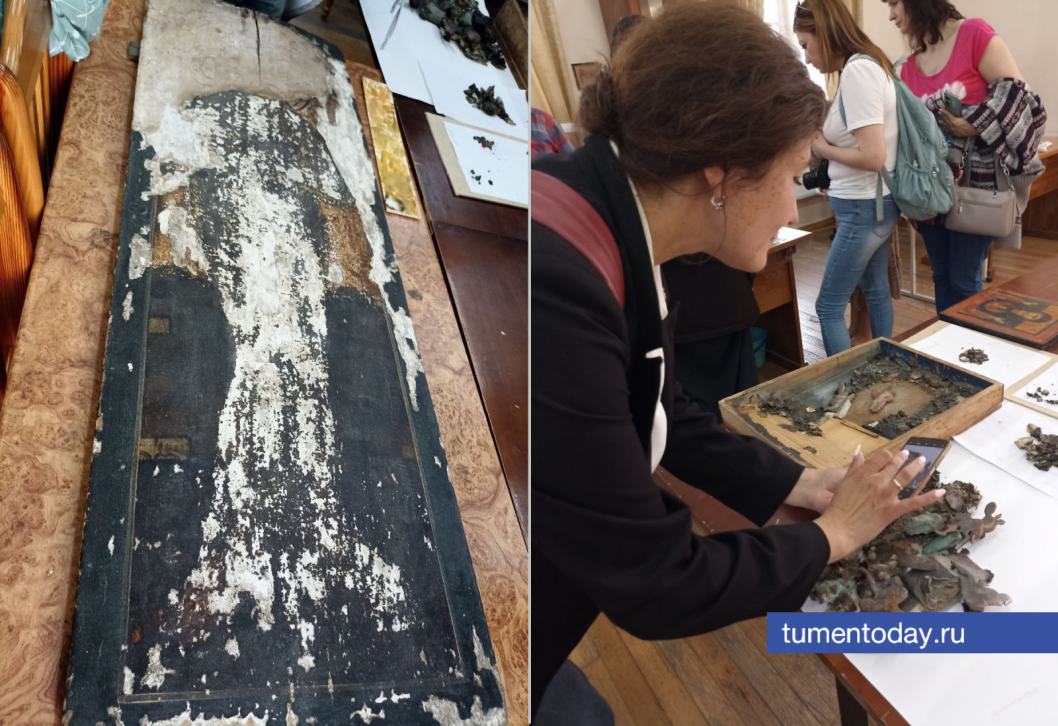 – Вот это неизвестный святой неизвестного автора. Мы даже пока не можем определить возраст иконы. От изображения едва сохранилась лишь нижняя часть. Мы надеемся, что, когда удастся снять темный налет, образовавшийся с течением времени, под ним мы сможем прочитать имя святого или найти еще какую-то информацию, по которой сможем понять кто же изображен на иконе, – говорит Монахиня Екатерина