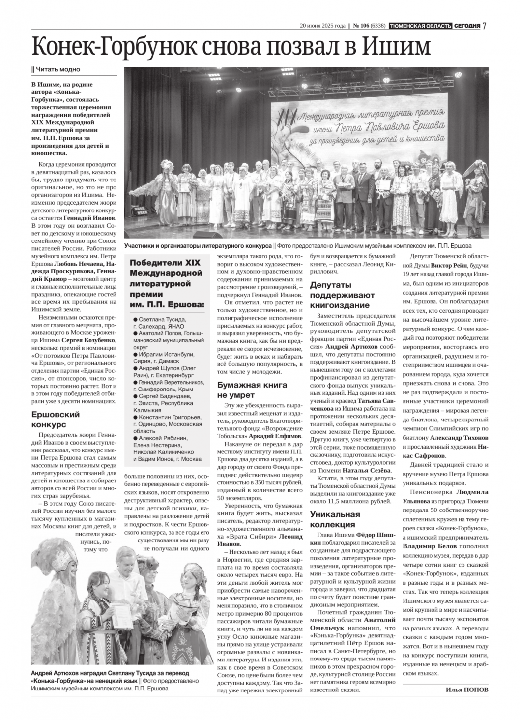 В Ишиме, на родине автора «Конька- Горбунка», состоялась торжественная церемония награждения победителей XIX Международной литературной премии им. П.П. Ершова за произведения для детей и юношества.