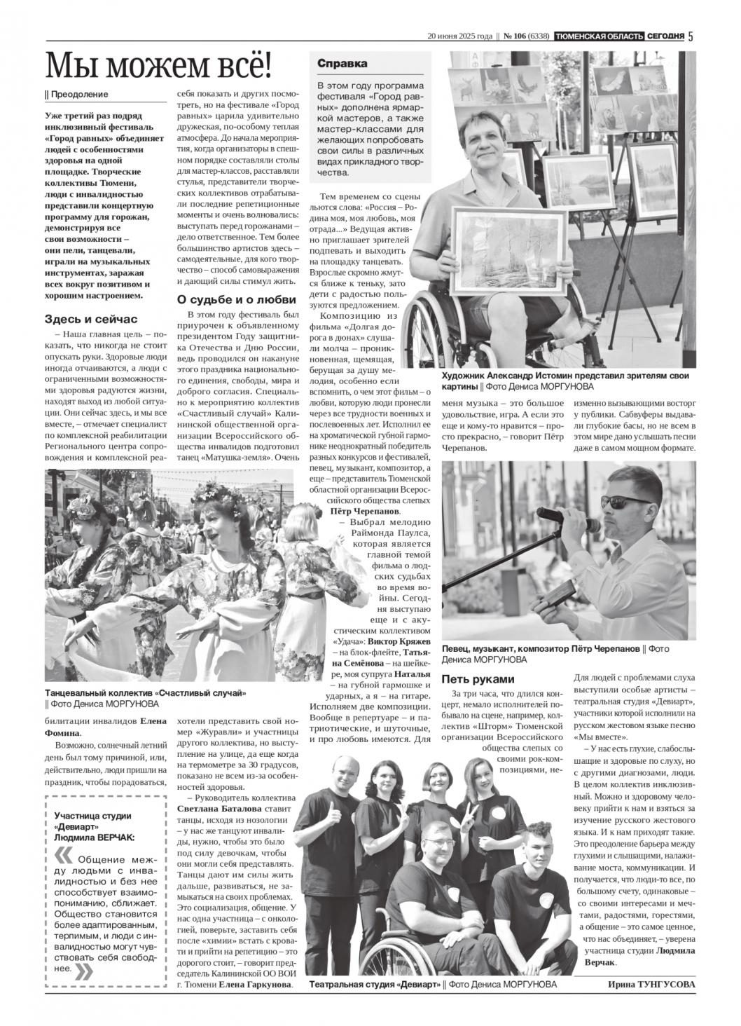 Уже третий раз подряд инклюзивный фестиваль «Город равных» объединяет людей с особенностями здоровья на одной площадке. Творческие коллективы Тюмени, люди с инвалидностью представили концертную программу для горожан, демонстрируя все свои возможности – они пели, танцевали, играли на музыкальных инструментах, заражая всех вокруг позитивом и хорошим настроением.