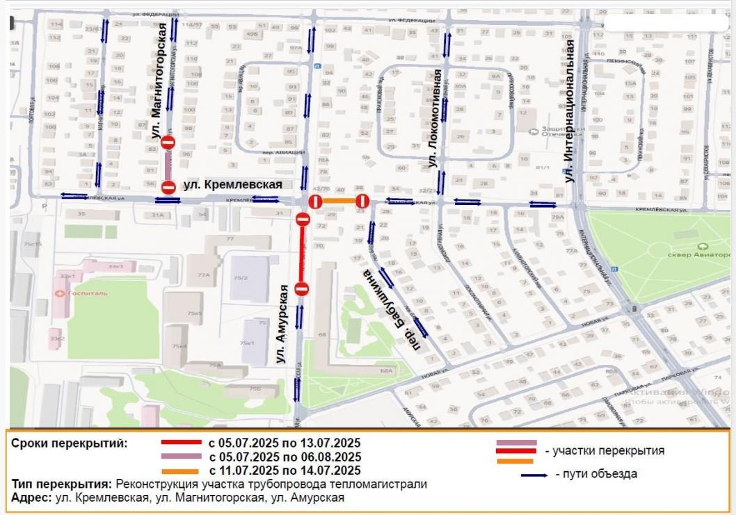 На участке от дома №75/2 по улице Амурской до улицы Кремлевской движение будет ограничено с 5 по 13 июля 2025 года.