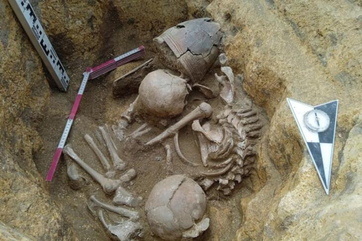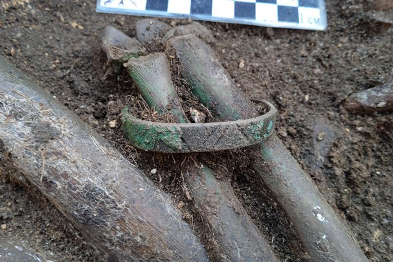 Второе захоронение содержит останки женщины и подростка. На руке женщины сохранился медный браслет.