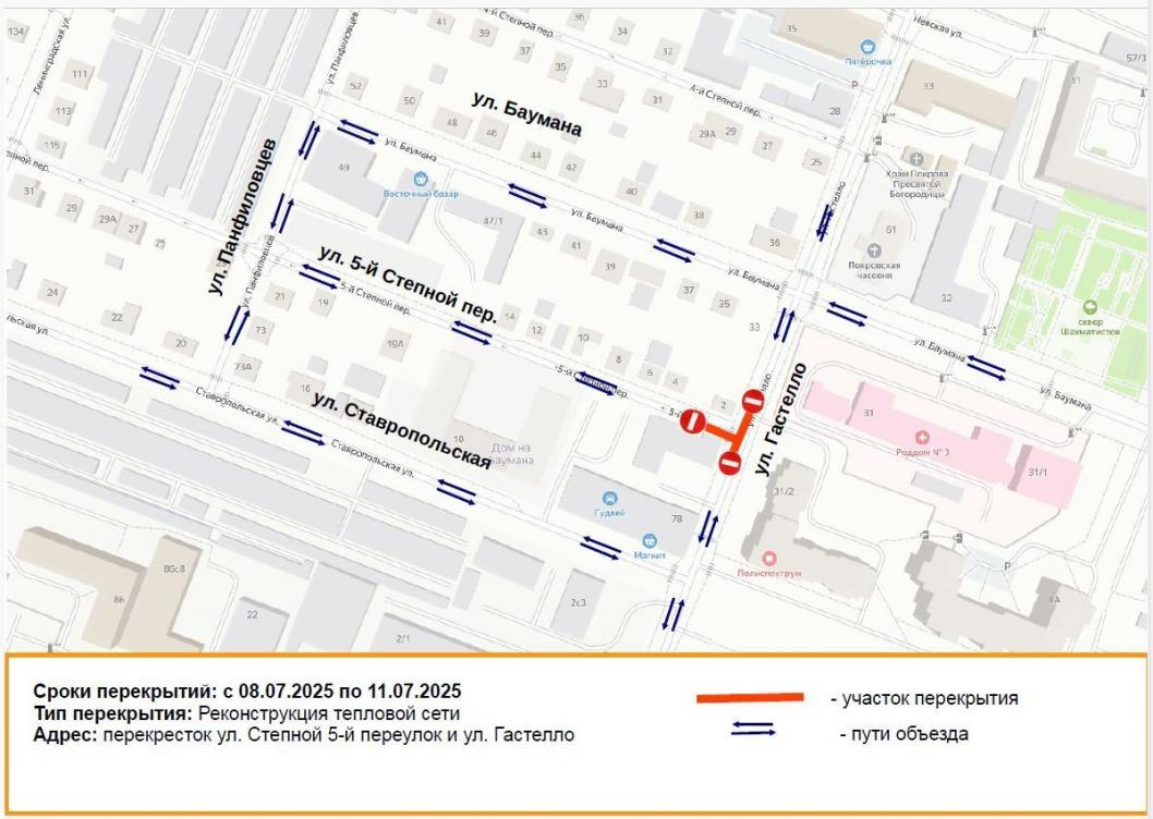 Кроме этого, с 8 по 11 июля планируется прекращение движения транспортных средств на перекрестке автомобильных дорог Степной 5-й переулок и Гастелло.