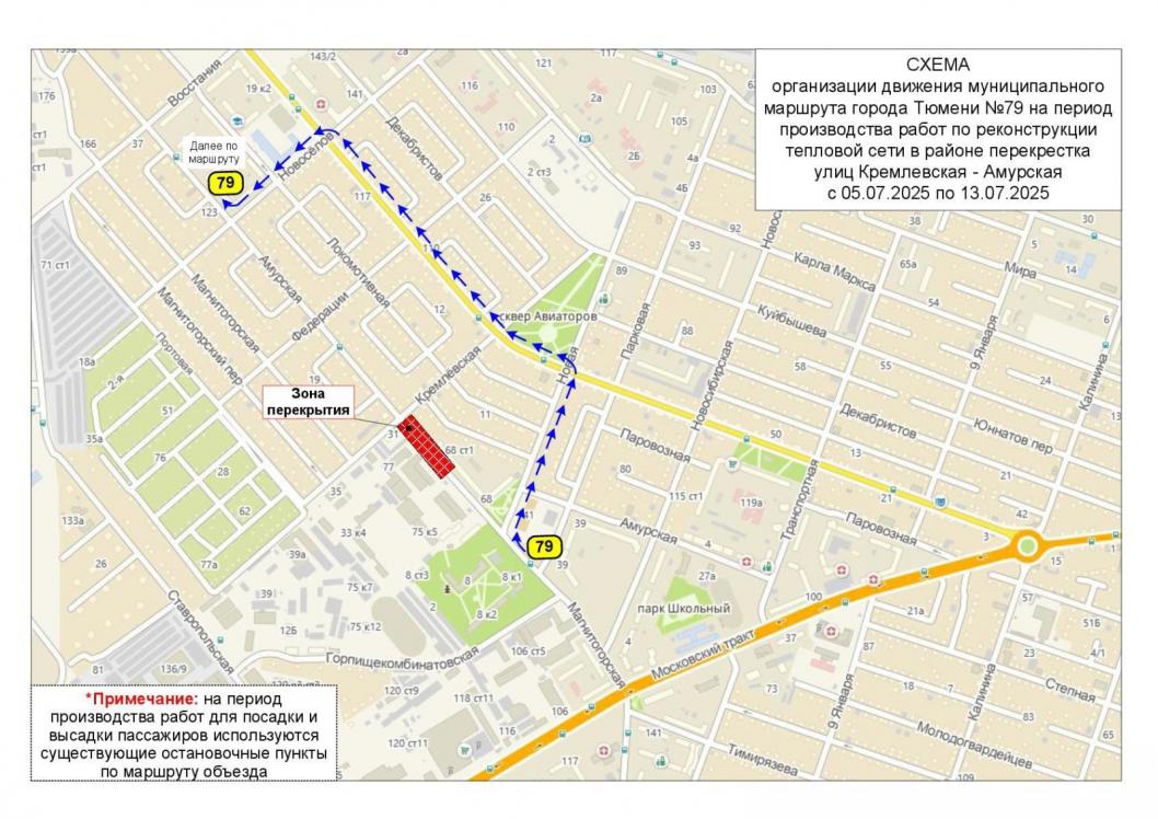 В нескольких точках областного центра продолжается ремонт сетей. Так, с 5 по 13 июля в связи с выполнением работ в районе перекрестка улиц Кремлевской – Амурской маршрут № 79 «мкр. Восточный – ЖК «Москва» будет следовать в объезд перекрытого участка со всеми существующими остановочными пунктами по маршруту объезда. Об этом сообщает МКУ «Тюменьгортранс».