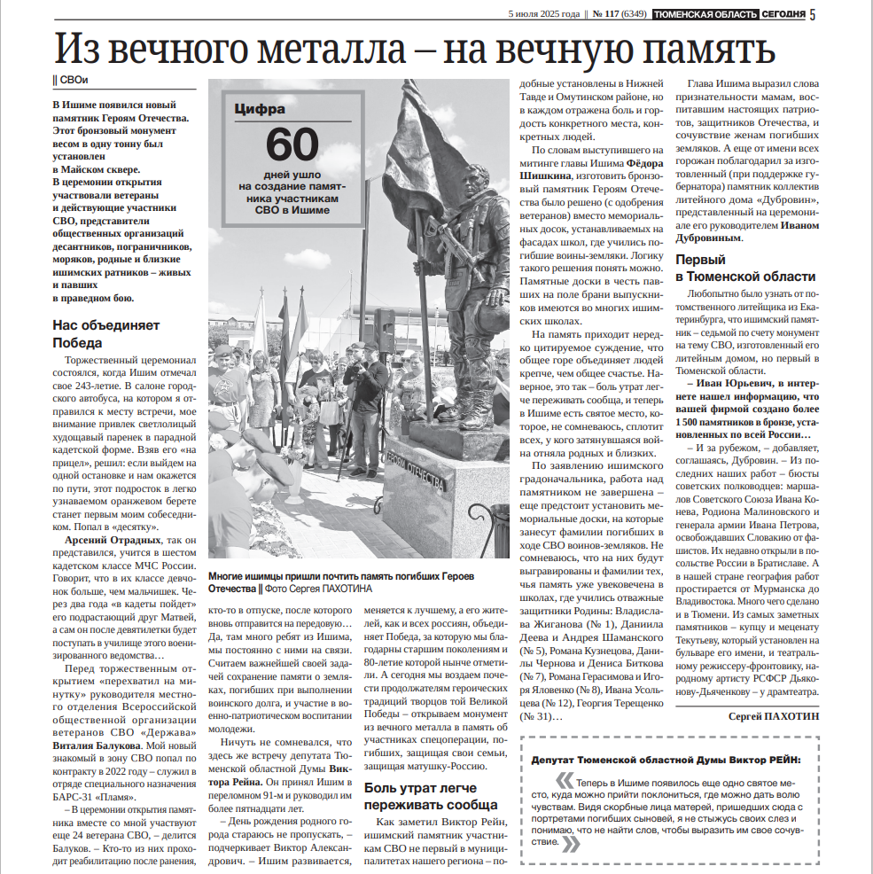 В Ишиме появился новый памятник Героям Отечества. Этот бронзовый монумент весом в одну тонну был установлен в Майском сквере. В церемонии открытия участвовали ветераны и действующие участники СВО, представители общественных организаций десантников, пограничников, моряков, родные и близкие ишимских ратников – живых и павших в праведном бою.