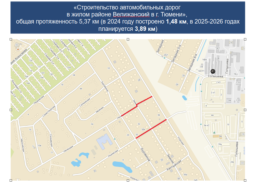 Всего в 2025 году ведется ремонт порядка 32,47 км на 31-й автомобильной дороге. Уже закончены работы на Уездной (ул. Престольная – ул. А. Протозанова), 50 лет ВЛКСМ (ул. Мориса Тереза – ул. Пермякова), 30 лет Победы (ул. Мельникайте – ул. Пермякова), Воронинских горках (Обход города Тюмени – ул. Метелевская, 2) и участке Ямской улицы. В планах порядка 30 улиц.