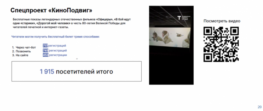 В 2025 году «Тюменская область сегодня» реализовала несколько крупных проектов. К празднованию Дня Победы организован проект «Киноподвиг», предусматривающий бесплатные показы фильмов о Великой Отечественной войне. Тюменцы могли посмотреть советскую классику на большом экране кинозала. Показы посетили почти 2000 тюменцев разных лет.