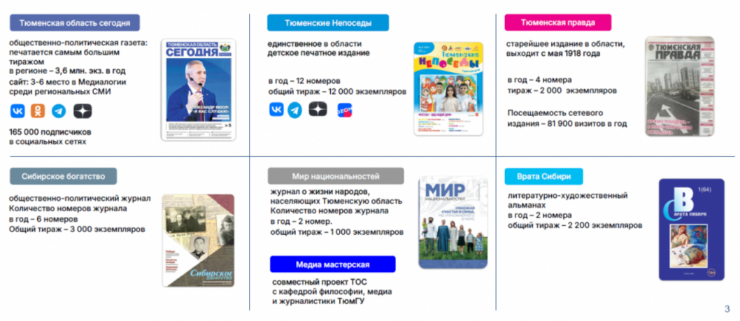 В состав медиахолдинга входят общественно-политический журнал «Сибирское богатство», в котором журналисты раскрывают уникальность Тюменского края через призму сибирского характера его жителей. Дважды в год выпускаются журнал «Мир национальностей» и литературно-художественный альманах «Врата Сибири», а каждый квартал печатается старейшая газета Тюменской области из ныне существующих «Тюменская правда».