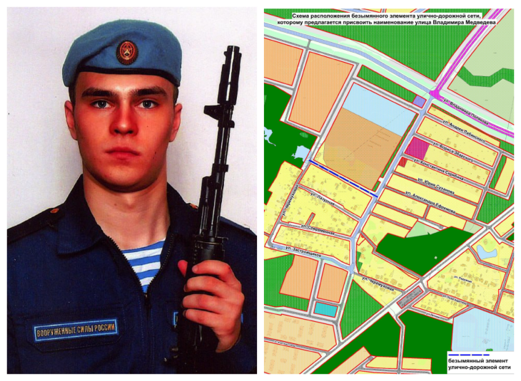 Предложение поступило от Тюменской городской общественной организации ветеранов десантных войск «Союз десантников». Медведев Владимир Сергеевич – участник специальной военной операции, награжден медалью «За отвагу» (предлагаемое наименование: улица Владимира Медведева).