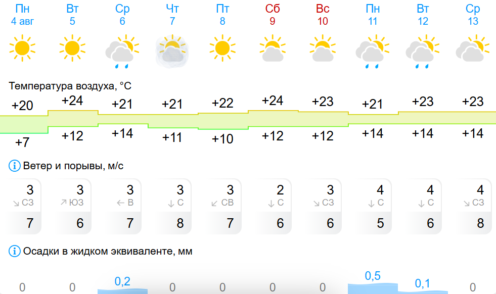В понедельник, 4 августа, утро началось с комфортных +16°C, а к полудню воздух прогреется до +20°C. Небо будет преимущественно облачным, без осадков. Легкий юго-западный ветер создаст приятную атмосферу.