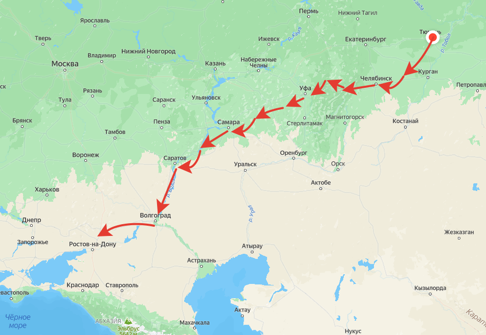 Маршрут Кирилла Казанцева. Расстояние по трассе от Тюмени до Ростова-на-Дону – 2574 км
