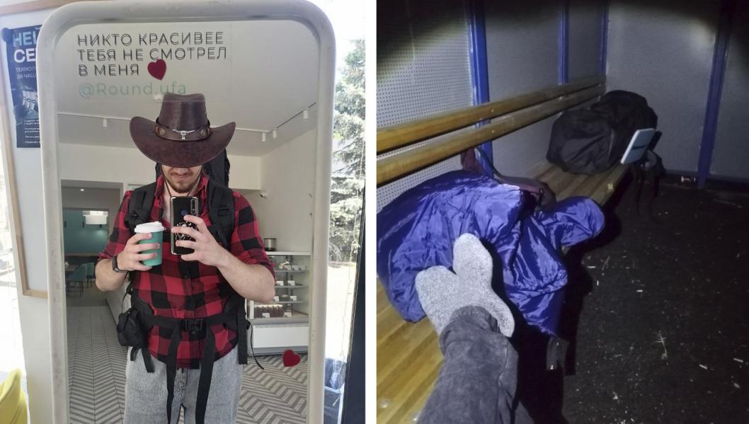 На ужин бананы и батончики. Быстрые углеводы берегут время и место в рюкзаке. Запив еду водой, Кирилл достал спальный мешок. Несколько слоев одежды и кокон спальника – постель на остановке готова. Палатку не брал, и об этом уже пожалел. Впредь для ночлега герой выбирал железнодорожные вокзалы в городах своего маршрута.