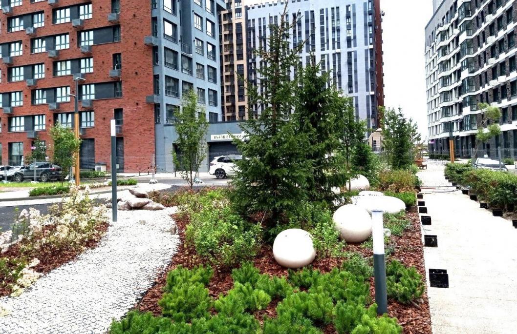 Но есть и новые решения. Во второй очереди жилого комплекса появились пузыреплодники с белыми цветами и бордовыми листьями, которые подчеркивают красно-коричневый фасад здания одного из домов. Вокруг игровых зон для детей высадили кустарники. Когда растения подрастут, они будут надежно защищать от ветра песочницы и игровые комплексы.