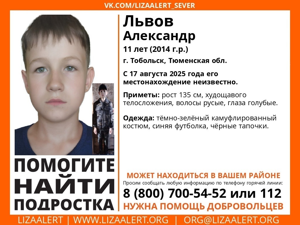 Жители Тюменской области обеспокоены пропажей 11-летнего Александра Л. Ребенок исчез в Тобольске 17 августа и до сих пор его местонахождение неизвестно. Поисковый отряд «ЛизаАлерт» и полиция продолжают поиск.