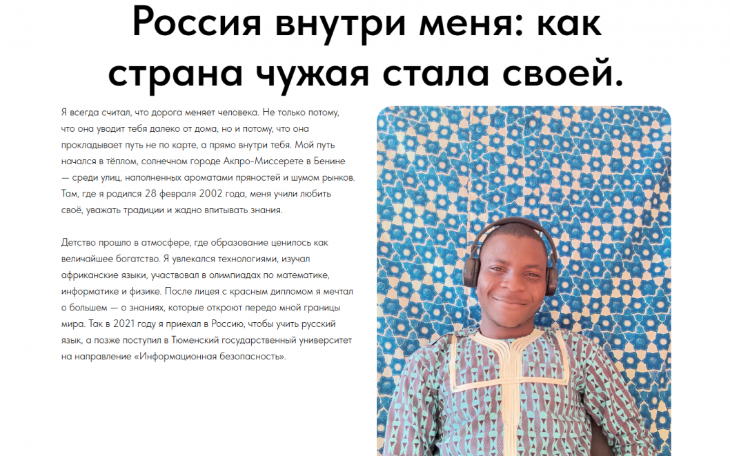 Иностранный студент ТюмГУ запустил международную медиаплатформу MEDIA ASTO. Новый медиапроект объединил молодежь из России, Африки, стран Ближнего Востока и Азии для открытого диалога и культурного обмена. «Тюменская область сегодня» пообщалась с автором – Роменом Гбетоо из Бенина.