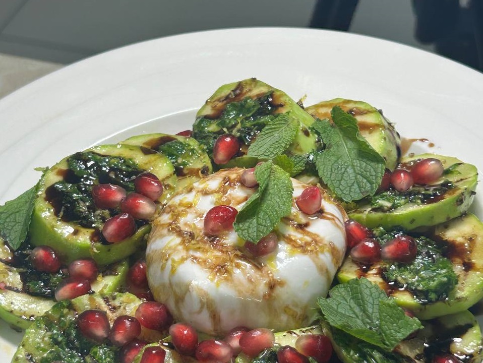 Так, руководитель Кулинарной школы Ксения Вахрушева предлагает сделать теплый салат с кабачками-гриль, моцареллой и гранатом.